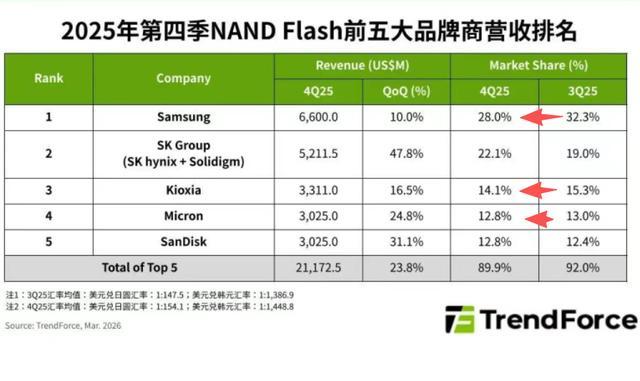 近日,有机构发布了全球NAND Flash产业在2025年四季度,前五大品牌的营收情况,从数据来看,前5大品牌营收这一季度大增增23.8%,达211.7亿美元。
